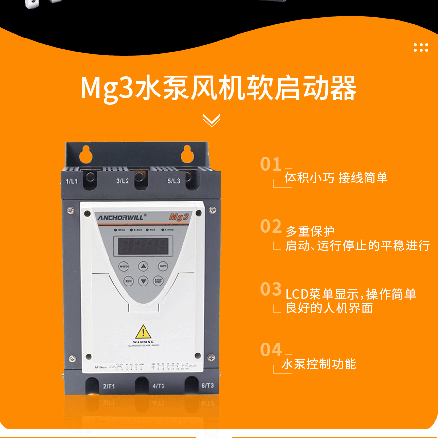 Mg3系列軟啟動器是艾克威爾根據水泵負載特點,研發的水泵可用型軟啟動器,采用解決的泵起停算法,解決了水錘現象和機械沖擊,實現泵類負載的運行。